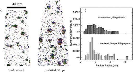 图3 a)热挤压14YT (Fe-14Cr-0.2Ti-0.3Y2O3, wt.%)合金在未辐照和辐照状态下的原子探针断层扫描(APT)体积重建。b)未辐照和辐照状态下纳米颗粒数量密度随粒子半径变化的对应直方图图。使用5 MeV Fe离子在700°C下进行照射,剂量为50 dpa。