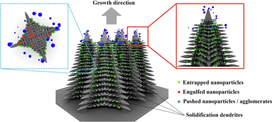图8 在AM凝固过程中,纳米颗粒与枝晶相互作用的说明说明显示了在枝晶结构内被吞没的纳米颗粒和在枝晶臂之间被包裹的纳米颗粒(绿色球体)。右框:纳米颗粒团块(蓝色球体)被推到枝晶尖端的前面。左框:枝晶内纳米颗粒(红色球体)被吞噬的枝晶横截面。