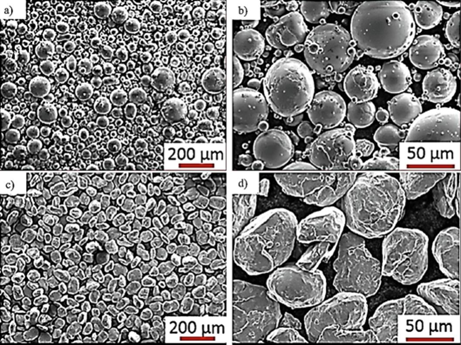 图7 a,b)不同放大倍率下Fe-14Cr不锈钢惰性气体雾化后球形形态的SEM图像。c,d)添加0.3 wt% Y2O3和0.3 wt% TiH2的Fe-14Cr不锈钢粉末在氢气环境中MA作用176 h后的SEM图像显示粉末颗粒呈非球面。