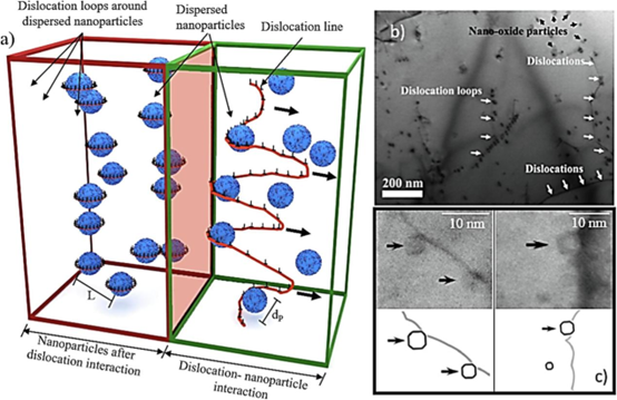 图1 a)氧化物弥散强化合金中Orowan机制的示意图,在与位错线相互作用期间(绿框)和之后(红框)显示分散的纳米颗粒。b) Fe-18Cr-2W-0.5Ti-0.3Y2O3 wt.%的ODS钢中纳米颗粒与纳米氧化颗粒相互作用的TEM图像。c) 14YWT ODS钢中纳米颗粒附着位错的高倍BFSTEM图像。