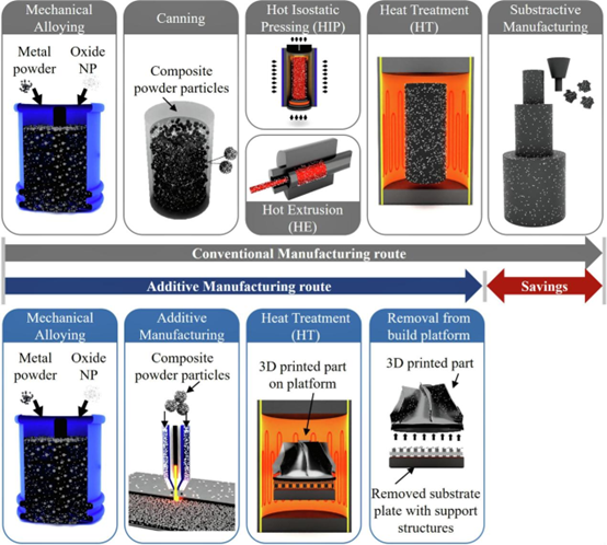 传统的制造路线包括机械合金化(MA)的复合粉末制造工艺,然后是罐装和随后的热等静压(HIP)和热挤压(HE)的粉末冶金固结工艺。固结后需进行炉基热处理和零件减形处理。增材制造路线也使用复合粉末原料,即机械合金工艺。增材制造工艺通常结合固化和成型,然后进行后续热处理。