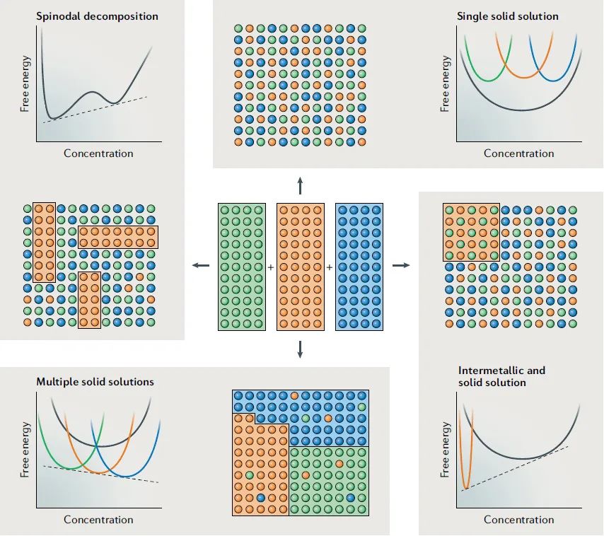 强度-韧性关系的阿什比图(Ashby plot)以及增韧机制。图片来源:Nat. Mater. [1]高熵合金(high-entropy alloy, HEA)作为一类新型金属材料,在冶金界引起了越来越多的关注。传统合金材料一般只含有一种元素作为主要成分,比如钢中的铁元素,而其他元素较少;高熵合金中每种组成元素含量相当,材料性能也与多种元素的存在相关。早在2014年,美国劳伦斯伯克利国家实验室(LBL)的Robert O. Ritchie团队就制备出单相面心立方结构的五元高熵合金 CrMnFeCoNi [2]。该材料表现出优异的抗损伤能力,抗拉强度超过 1 GPa,断裂韧性超过 200 MPa•m1/2,而且更有意思的是,这种高熵合金的强度和韧性在低温下(液氮温度,约77 K)甚至表现的更好。