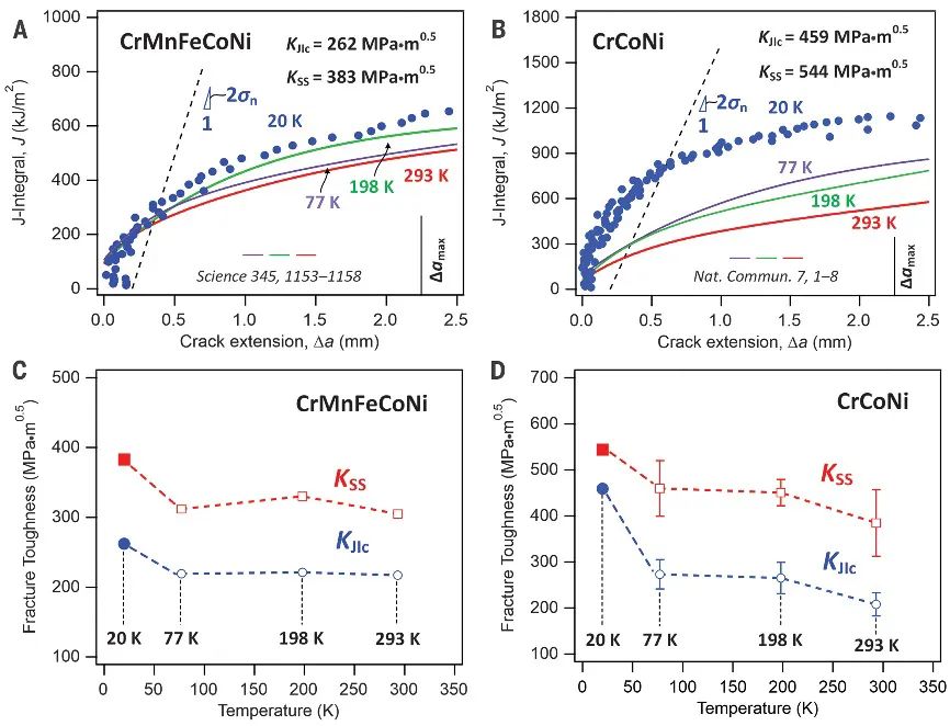 三种合金元素混合的可能性。图片来源:Nat. Rev. Mater. [3]研究者首先比较了相同制备方法下,CrCoNi和之前报道的CrMnFeCoNi两种合金的力学性能。在经过电弧熔化、滴铸、均化、高温再结晶后,两者的平均晶粒尺寸分别为~21 μm和~8 μm。单轴拉伸应力-应变曲线和J阻力曲线(R曲线)显示,两种合金在20 K(液氦温度)下的韧性均高于其他温度。其中,CrMnFeCoNi的裂纹萌生断裂韧性(KJIC)和裂纹扩展韧性(KSS)分别为262和383 MPa•m1/2,而CrCoNi的相应值为459和544 MPa•m1/2,大大高于前者。如果对这个数值没有概念,可以举一个常见的例子,客机中常用的铝基机身在相同条件下的断裂韧性仅为 35 MPa•m1/2左右。