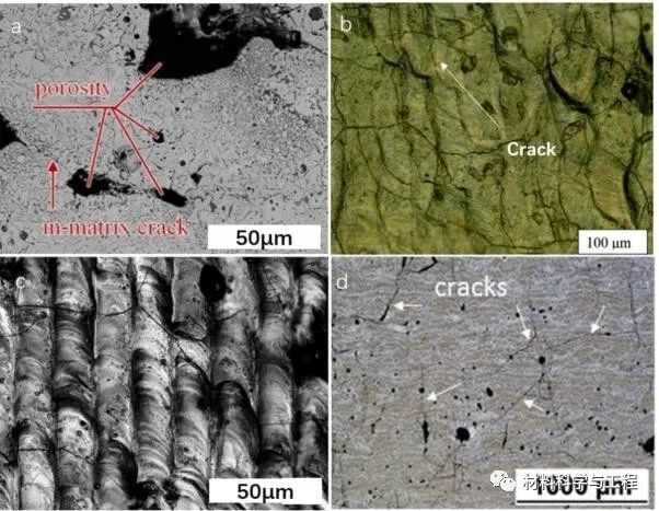 论文提出,相对密度作为WC-Co硬质合金增材制造工艺综合评价指标,主要由孔隙、裂纹等冶金缺陷决定,受原料粉末特性和制备工艺影响。PBF技术的加热时间短,局部温度高,温度梯度陡峭,熔体熔化、凝固过程需在数百微米级的熔池范围和数百毫秒级的熔化时间内完成,若粉末熔化不完全,则粉末颗粒间的孔隙通常难以消除,进而形成不同类型的孔隙及裂纹。此外,PBF技术制备WC-Co硬质合金的过程中,WC-Co体系会发生系列物理化学反应,形成WC相和Co基固溶体相(Co-C-W),易导致非平衡相、脱碳相(η相)产生,且样品易发生明显的晶粒不均匀长大,形成多尺度晶粒组织和层状结构,降低力学性能。因此,基于目前的技术水平,提高相对密度,减少冶金缺陷(如裂纹、孔隙、η相、晶粒不均匀长大)仍然是PBF技术制备WC-Co硬质合金的关键难点。