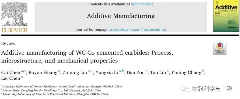 近日,中南大学粉末冶金国家重点实验室、湖南博云东方粉末冶金有限公司和稀土功能材料湖南省重点实验室的研究人员针对WC-Co硬质合金增材制造工艺、冶金缺陷、显微组织和力学性能发表了综述论文,相关工作以“Additive manufacturing of WC-Co cemented carbides: Process, microstructure, and mechanical properties”为题在国际顶级期刊《Additive Manufacturing》发表,期刊影响因子11.632。论文在中南大学黄伯云院士指导下完成,博士生陈才为本文第一作者,刘祖铭教授为通讯作者,中南大学为本文通讯作者单位。