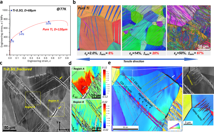 在钛合金中,O元素可谓是一把双刃剑,既可以起到强化作用,但同时极大地降低了合金的塑性。当合金中的O含量达到3%时,合金在77K表现出极差的塑性,阻碍了钛合金在液体火箭发动机以及液氮/氦容器中的应用。O元素的添加导致合金从穿晶断裂转变为晶内断裂。在实际生产中,应尽量控制O的含量,这无疑增加了其成本。这种不利于钛延展性的氧敏感性的机制很大程度上归因于局部塑性变形和脆弱的晶界。如何保持高O钛合金具有较高的延展性已经成为了国际性难题。