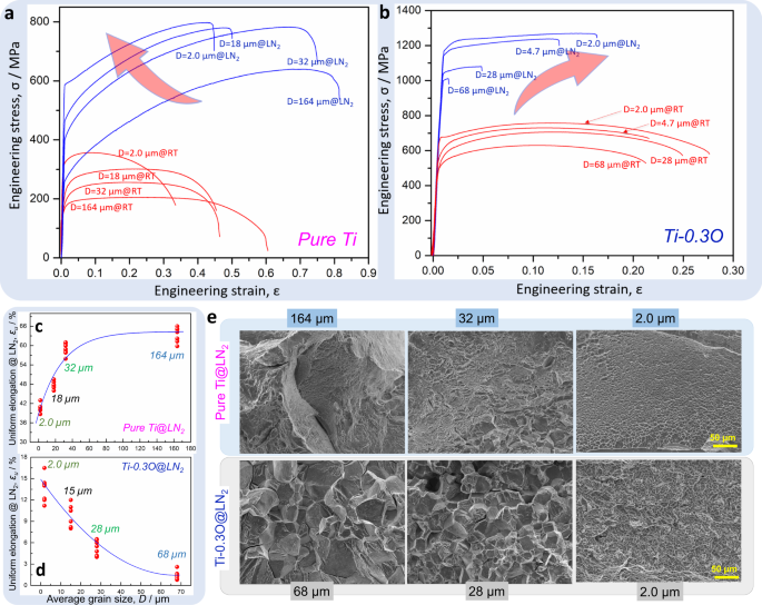 近日,来自美国加利福尼亚大学的Andrew M. Minor教授,日本京都大学的Nobuhiro Tsuji和Tomohito Tsuru教授提出了一种晶粒细化的结构策略,成功解决了上述问题。在Ti-0.3wt中,超细晶粒(UFG)微观结构(晶粒尺寸~ 2.0 μ m)的均匀伸长与77 K时极脆的粗晶粒相比,成功地提高了一个数量级,并保持了UFG微观结构固有的超高屈服强度。这种独特的强度-延展性协同是通过稀释的晶界偏析(有助于提高晶界结合能)和增强的<c + a>位错活性(有助于提高应变硬化能力)共同作用实现的。这种策略不仅促进高强度Ti-O合金在低温下的潜在应用,而且还可以应用于其他合金体系。相关成果以“Grain refinement in titanium prevents low temperature oxygen embrittlement”发表在国际著名期刊Nature Communications上。