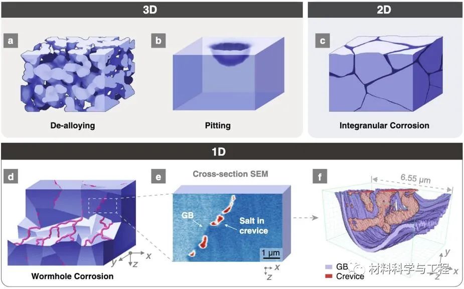 图1: 三维,二维和一维腐蚀的区别。(a-b)常见三维腐蚀的示意图 (去合金化腐蚀和点腐蚀)。(c)常见二维腐蚀的示意图 (晶界腐蚀)。(d)本文中定义的一维虫洞腐蚀的示意图。(e)熔盐真实腐蚀截面图(颜色为后期添加)。(f)三维重构显示(d)中截面上不连续的孔洞实际上在三维空间中是贯通的。这些内含熔盐的孔洞依附于晶界之上。