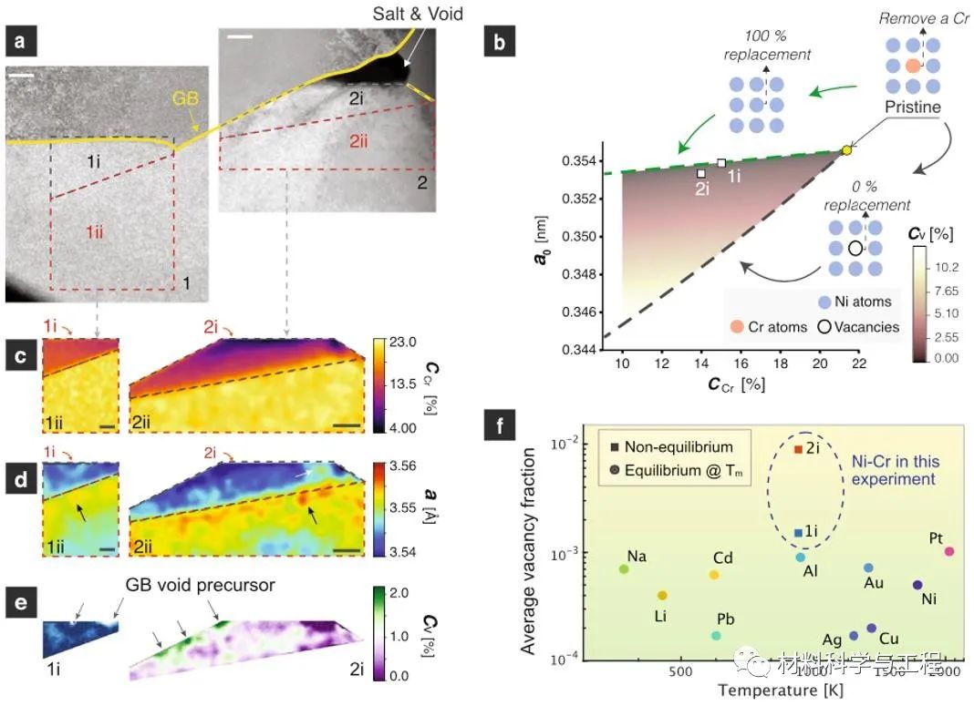 图4:空位表征。(a)扫描透射电子显微镜-高角环形暗场像;(b)由DFT计算得到的相图;(c )腐蚀虫洞附近的铬元素分布;(d)4D-STEM测得的晶格常数分布;(e)空位分布图;(f)虫洞附近的空位浓度远高于常见金属在熔点附近的平衡空位浓度。