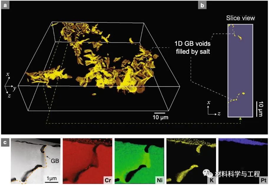 图2: 更大体积的FIB-SEM三维重构显示了一维虫洞腐蚀的形态分布。腐蚀虫洞附近的元素分布显示了铬的流失以及熔盐的入侵。
