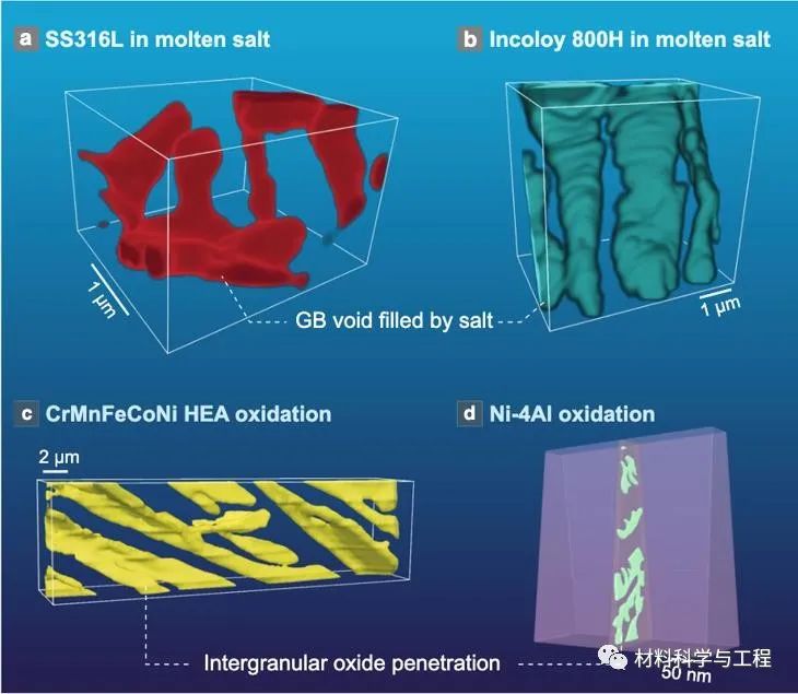 图5.通过电子显微学三维重构获得的一些其他腐蚀材料和系统的类似一维腐蚀的形态。(a)高温熔盐腐蚀的316不锈钢。(b)高温熔盐腐蚀的铬镍铁合金。(c)高温空气氧化的高熵合金。(d)高温水氧化腐蚀的镍铝合金。