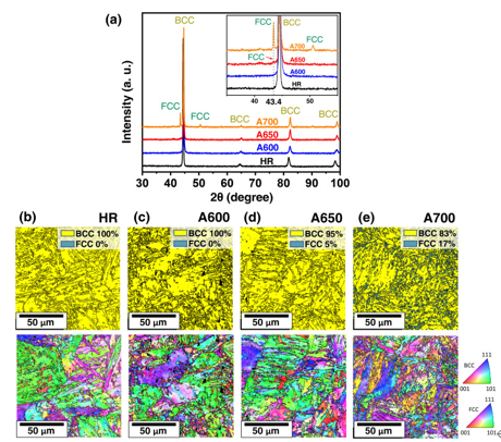 图1.热轧和老化条件下Fe-MEA的微观结构表征。(a)HR和老化样品的同步XRD模式。插入a是(b)HR、(c)A600、(d)A650和(e)A700样本的两个theta范围的放大部分,即35∼55° EBSD相位图和IPF图。