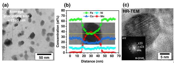 另一方面,在过去十年中,一种基于多原理元素(MPE)的新型新兴合金具有巨大的成分范围,引起了材料科学研究人员的广泛关注。基于MPE设计的合金被称为多原理元素合金(MPEA)或浓缩复合合金(CCA)。根据它们的配置熵,它们最广为人知的是高熵合金(HEA)或中熵合金(MEA)。自2004年发现高熵合金设计概念以来,已经开发出许多具有先进机械性能的合金,如拉伸性能,断裂韧性,耐疲劳性或超塑性。具有原子尺寸不匹配的多种元素的固体溶液形成导致严重的晶格变形和大规模固体溶液强化,这是一个很大的优点,在很大程度上有助于提高这些合金的屈服强度(YS)。在HEA和MEA的几个类别中,基于铁的非等原子MEA(Fe-MEA)因其相对较低的成本和优异的拉伸性能而得到了积极研究。Fe-MEAs的大成分范围为开发超强材料提供了巨大的可能性,它结合了传统钢中使用的强化机制,如降水强化或变形诱导的马氏体转化转化为上述MEA的大规模固体溶液强化。