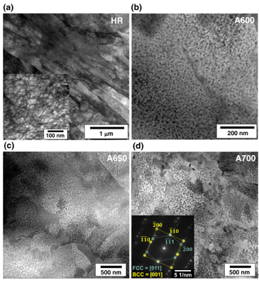 图2.(a) HR、(b) A600、(c) A650和(d) A700样品的STEM图像。插入(a)显示高放大倍率的STEM图像,说明高位错密度。在(d)中插入显示与(d)对应的选定区域衍射(SAED)模式。