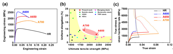 图7.在当前工作中实现的拉伸性能,并与其他合金的比较。(a)在HR和老化条件下,工程应力与MEA的应变曲线。(b)拉伸性能与其他超高强度合金的比较。(c)真实应力和应变硬化率与应变曲线。