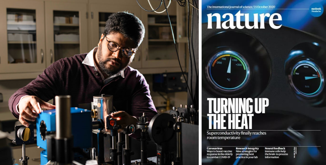 美国纽约罗切斯特大学的物理学家Ranga Dias教授在美国物理学年会上报告了最新研究成果,用氢,氮和镥制成的材料,混合钻石对顶砧装置中,通过改变压力,并测量化合物中的电阻。研究表明在约294 K(21℃)的温度下,这种材料似乎失去了任何对电流的阻力。但仍然需要10 千巴的压力,大约是我们大气压力的10000倍。但这远远低于在室温附近工作的超导体通常需要的数百万个大气压。如果得到证实,这将使该材料在实际应用中更有希望。如果这一成果获得证实,或将预定诺奖。2020年10月14日,《自然》封面介绍了罗彻斯特大学发表的一篇重磅论文,纽约罗切斯特大学的物理学家Ranga Dias与Salamat等合作者一起创造出一种氢化物材料,首次在高达15℃的温度下,观察到常温超导现象。这是高温超导材料的全新记录,这一突破性进展也代表着,人类向着长久以来希望创造出具有最优效率电力系统的目标又迈近了一步。文章一经发表,立刻引发全球关注,同期Science发表了“At last, room temperature superconductivity achieved”的评论,赞叹“终于实现了室温超导”。