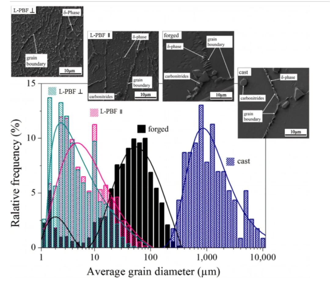 图10.IN718加工后L-PBF的组织和晶粒分布。还包括锻造和铸造的显微组织及相应的SEM图片。