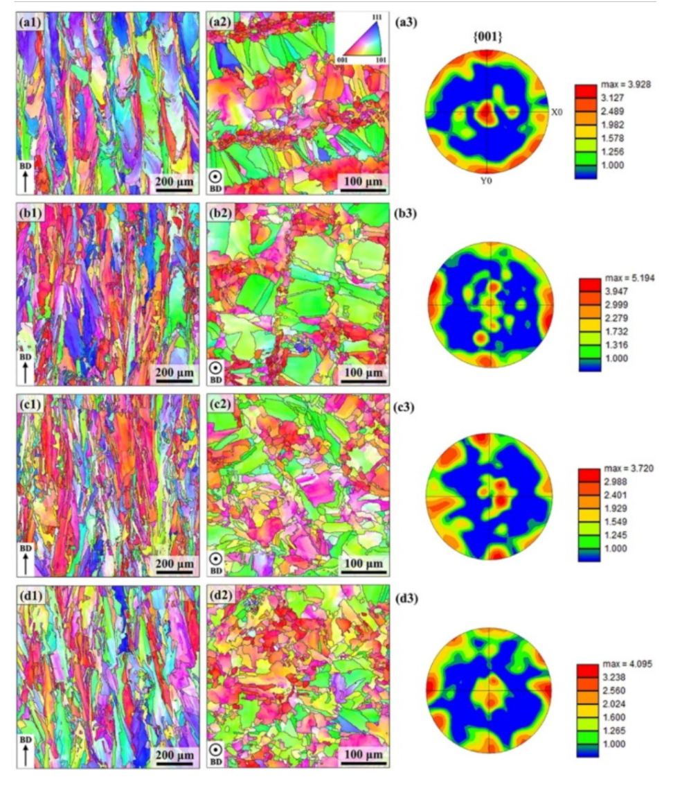 图5.电子背散射衍射(EBSD)和反极图(IPF) Z图分别显示了不同扫描策略(a)不旋转扫描线扫描、(b)旋转扫描线扫描、(c)旋转扫描线扫描和(d)旋转扫描岛扫描)处理哈氏X的L-PBF的晶粒形貌。注意,第1行对应于相对于构建方向的颗粒结构;第2行对应横向上的晶粒结构;第3行给出了每个条件的极点图。