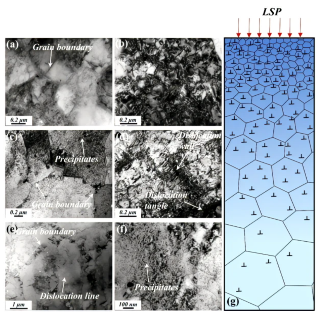 图8.激光喷丸处理IN625的透射电镜(a,b)顶部表面,(c,d) 100 μm深度,(e,f) 1000 μm深度。(g)显示微观结构概述的示意图。