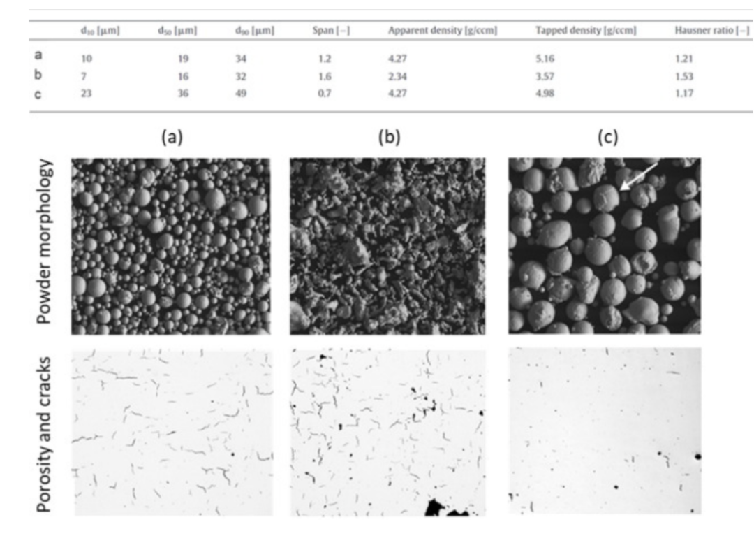 图4.(上)粉末特性,例如尺寸分布,表观密度和振实密度以及Haunser比率,粉末的(中)扫描电子显微照片,以及L-PBF加工镍基合金横截面处的(底部)光学图像,指示孔隙率和开裂缺陷。