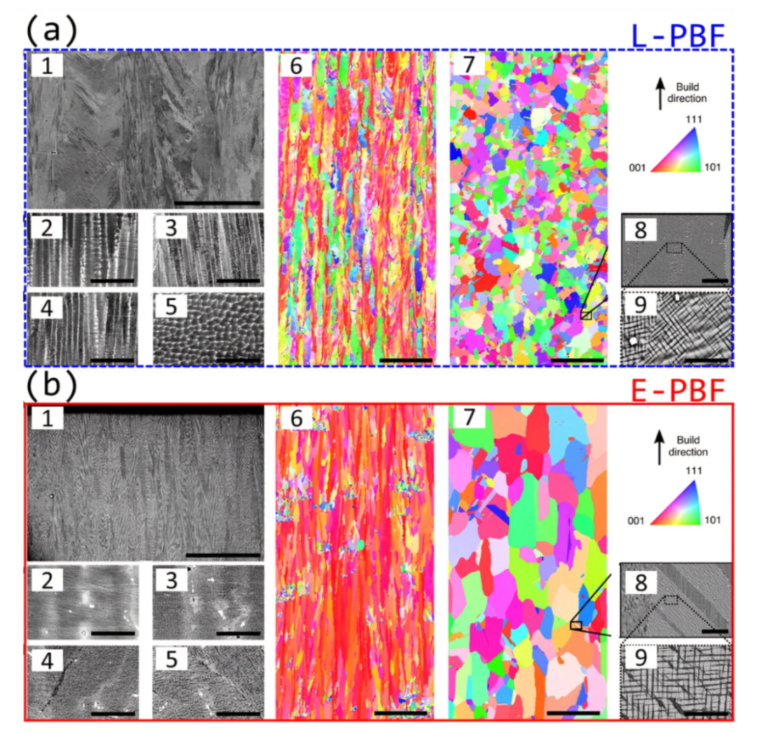 图9.(a)中L-PBF和(b)中E-PBF处理的SB-CoNi-10高温合金:(1)显示建成后微观结构的拼接BSE图像。在最终构建层附近,1mm以下,2mm以下和4mm以下的特定微结构分别显示在(2),(3),(4)和(5)中。(6)和(7)分别显示了新建和热处理样品的垂直截面IPF Z图。(8)和(9)进一步强调了高倍观察显示热处理样品的γ-γ′结构。注意(1)的比例尺为50 μm;(2 ~ 5)的比例尺为5 μm;(6)和(7)的比例尺为500 μm;(8)比例尺为25 μm;(9)的比例尺为5 μm。