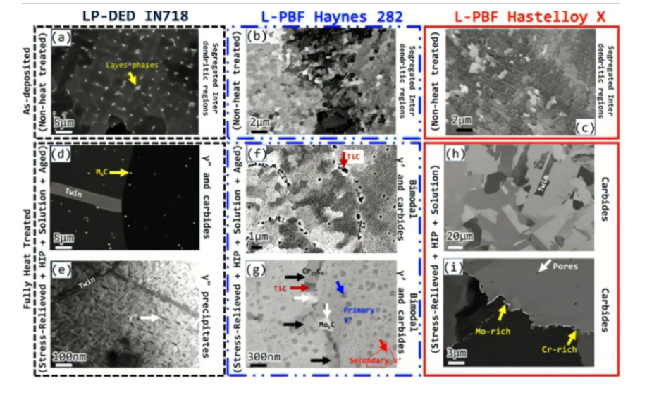 图11.IN 718 LP-DED、Haynes 282 L-PBF和Hastelloy X L-PBF样品在不同热处理条件下的典型SEM显微图:(a)-(c)沉积态(NHT), (d)-(e)完全热处理IN 718 LP-DED(即1065℃/1.5小时应力恢复(SR) + 1162℃/3.5小时均质+ 1065℃/1小时溶解+ 760℃/10h完全时效+650℃/10h) ;(f)-(g)完全热处理的Haynes 282 L-PBF(即,1065℃/1.5小时的应力恢复(SR) + 1165℃/3.5小时/100 MPa的HIPed + 1135℃/1hr的溶解+ 1010℃/2h的完全时效+788℃/8h) [187];(h)-(i)完全热处理的哈氏合金X L-PBF(即,1065°C/1.5小时的应力恢复(SR) + 1165°C/3.5小时/100 MPa的HIPed +在1177°C/3小时的溶解。