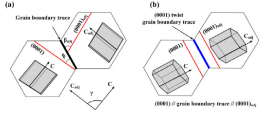 图10. (a) G参数中三个特定角度和(b) a(0001)扭转晶界示意图