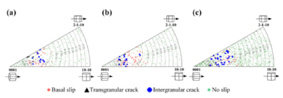 图4.在(a) S-25、(b) S-50和(c) S-100中,随机织构的αp晶粒经6000次循环、穿晶裂纹(黑色)和晶间裂纹(蓝色)后的晶体取向(红色)。晶体取向是相对于拉伸轴的。