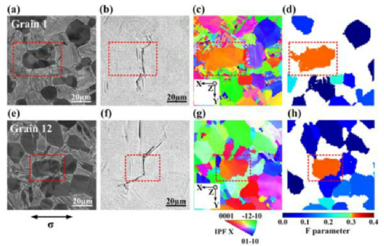 图11.(a) (d) G参数图,(b) (e)光学显微图,(c) (f) S-25和S-50出现晶间裂纹区域的BSE图像,显示了扭转晶界的分布及其与晶间裂纹存在的相关性;(g) g参数图显示S-100的扭转晶界分布,高倍视图用黑框表示,显示两个已识别的扭转晶界A和B,其中基滑移施密德因子小于0.25的晶界用浅灰色表示;(h)光学显微图显示与(g)相同的区域和a处存在晶间裂纹。注意,在扭转晶界B处没有出现晶间裂纹,在那里相邻的晶粒对在基底< a >滑移中没有很好的取向。(i)同一区域的F参数图,显示了未观察到的穿晶裂纹的潜在起始点。