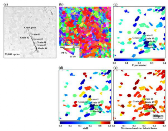 图13.(a) 100次循环,(b) 1000次循环,(c) 10,000次循环和(d) 25,000次循环后,BSE显微图显示S-50中微织构区域的穿晶裂纹的发展;(e)和(f)为(c)的放大区域。