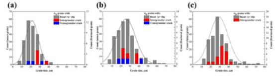 图2.(a) S-25、(b) S-50和(c) S-100中αp表观晶粒尺寸直方图,用等效直径表示,描述了αp晶粒在基底< a >滑移、晶间裂纹和穿晶裂纹的分布。