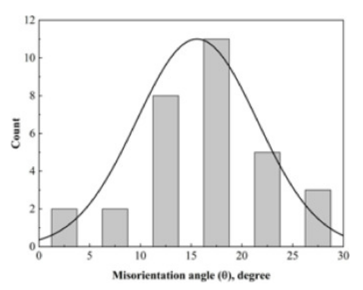 图6.取向偏差角直方图显示在所有晶间裂纹位置都存在扭转晶界。