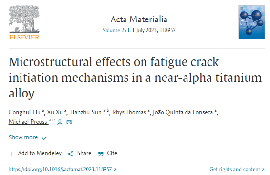 英国曼彻斯特大学Michael Preuss 教授团队的这项研究成果以题为Microstructural effects on fatigue crack initiation mechanisms in a near-alpha titanium alloy发表在国际期刊Acta Materialia上。