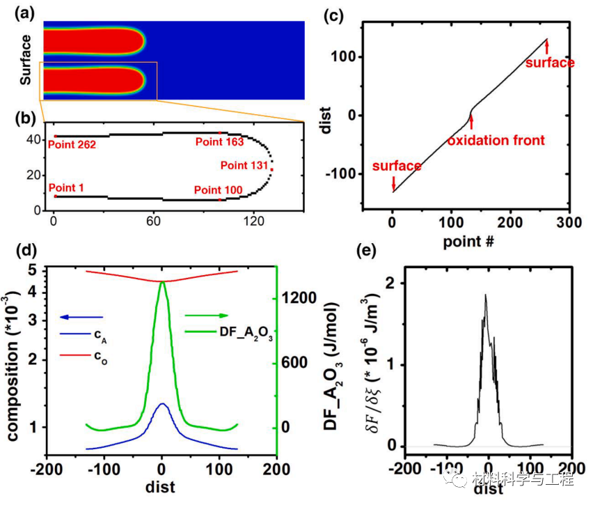 图 7. 氧化过程中 t = 27000s 的代表性时间范围的驱动力分析。(a) 氧化曲线 t = 27000s,显示矩阵(蓝色)中有两个氧化物颗粒(红色)。(b) 由等值面跟踪方法确定的顺序界面点。(c) 界面点数作为该点与氧化前沿点之间的加权距离的函数。(d) A 和 O 成分和反应驱动力作为称重距离的函数。(e) 整体驱动力 δF/δξ 作为加权距离的函数