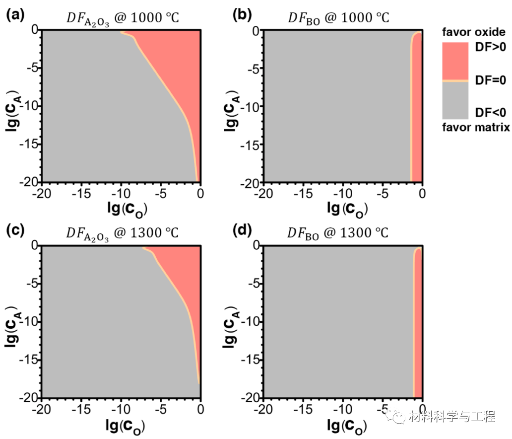图 1. 在 1000 C 和 1300 C 时,氧化 DFA2O3 和 DFBO 的驱动力与 A 和 O 的组成以及 A2O3和 BO 的关系。橙色区域表示相应的氧化反应驱动力为正,有利于相应氧化物的形成。