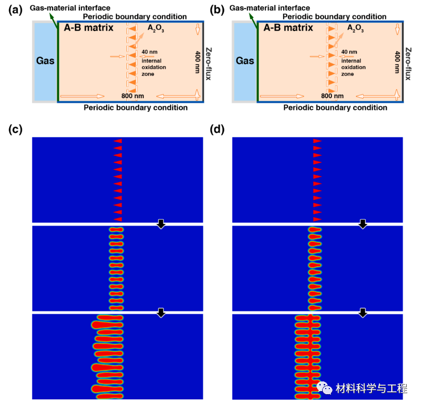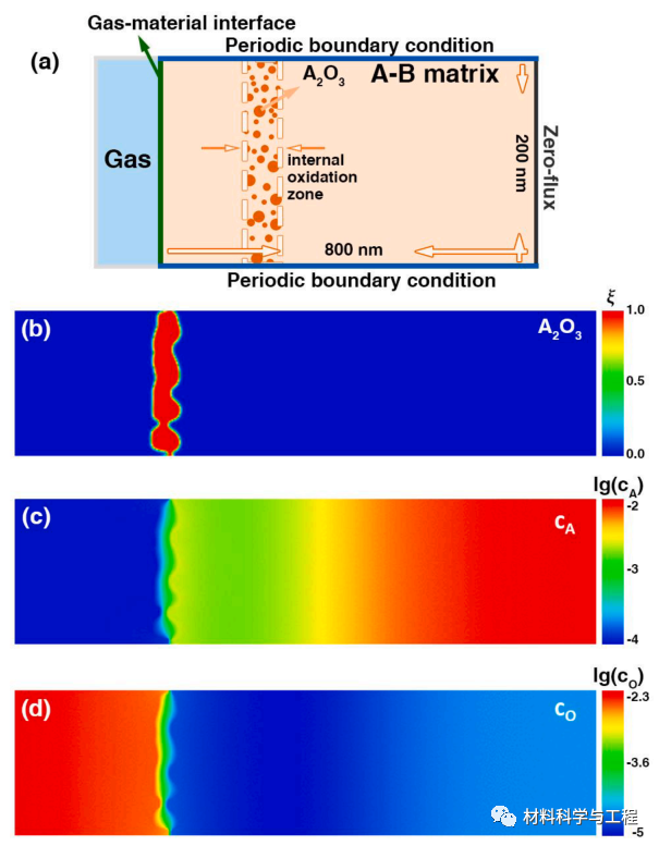 图2. 本模型对A-B合金的二维模拟实例。(a) 模拟设置,在此演示中,将具有随机半径和分布在内部氧化区的圆形核输入到模拟系统中,初始 A 成分在气体-材料界面附近耗尽,基体中的 c0A = 0.1。(b)–(d) A2O3(红色)、cA 和 cO 在 t = 200 秒时的分布图。