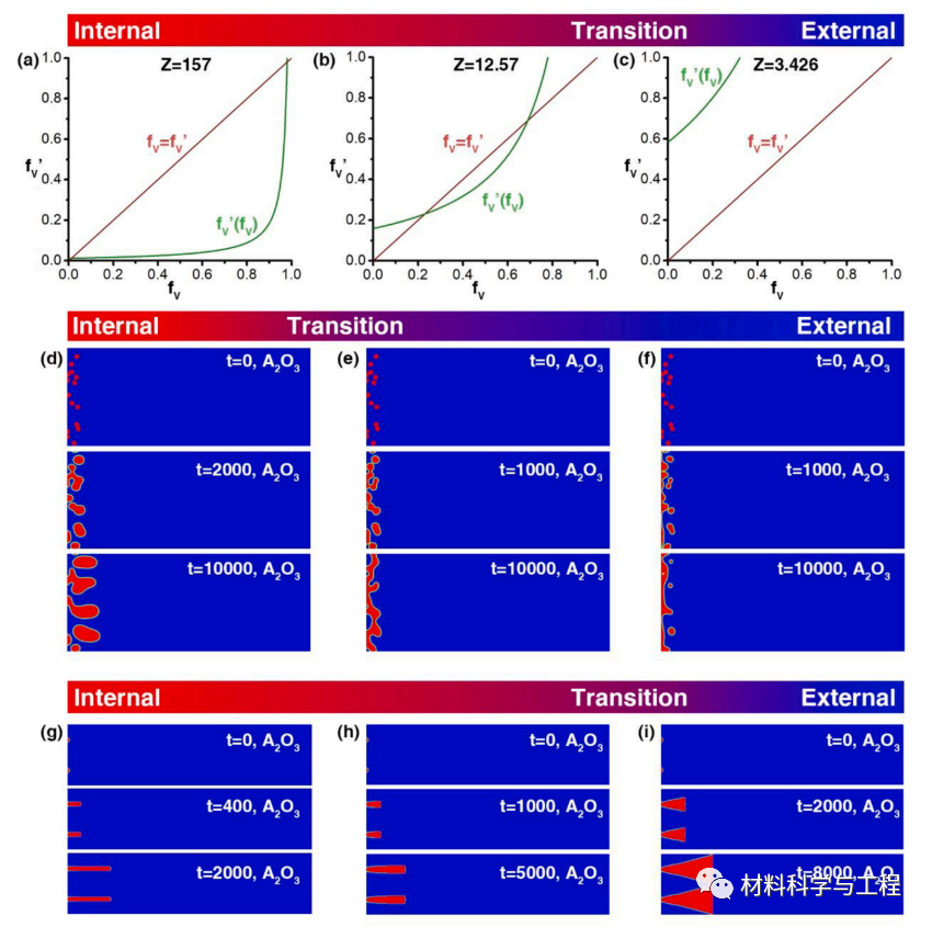 图 4. 相场模型与 Zhao 分析模型的氧化结果对比。(a)–(c) Zhao 的分析模型使用不同的 Z 值(即不同的扩散系数和初始成分)预测氧化结果。(d)–(f) 相场模型分别使用 (a)–(c) 中指定的参数对 A2O3(红色)的演化曲线。(g)–(i) A2O3(红色)的演化曲线,假设阻止 A 在内部氧化区内扩散.
