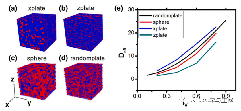 图 8. 有效扩散率随氧化物体积分数 fV 的变化而变化,具有不同的氧化物核形状和分布。(a)–(d) 氧化物的不同初始设置,分别为垂直于 x 轴的圆盘形状、垂直于 z 轴的圆盘形状、球形、具有随机方向的圆盘形状。(e) 使用 (a)-(d) 中的不同设置作为 fV 函数的有效扩散率。