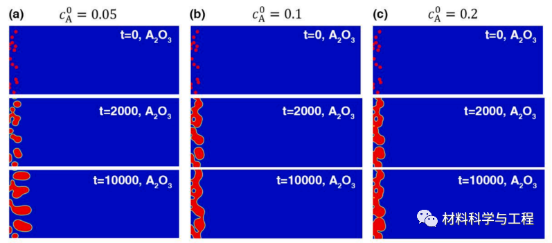 图 5. 初始圆形氧化物核随机分布在基质-氧界面附近(模拟框左边界)的二维系统的相长相仿真结果,分别为(a)c0 A = 0.05、(b)c0 A = 0.1、(c)c0 A = 0.2