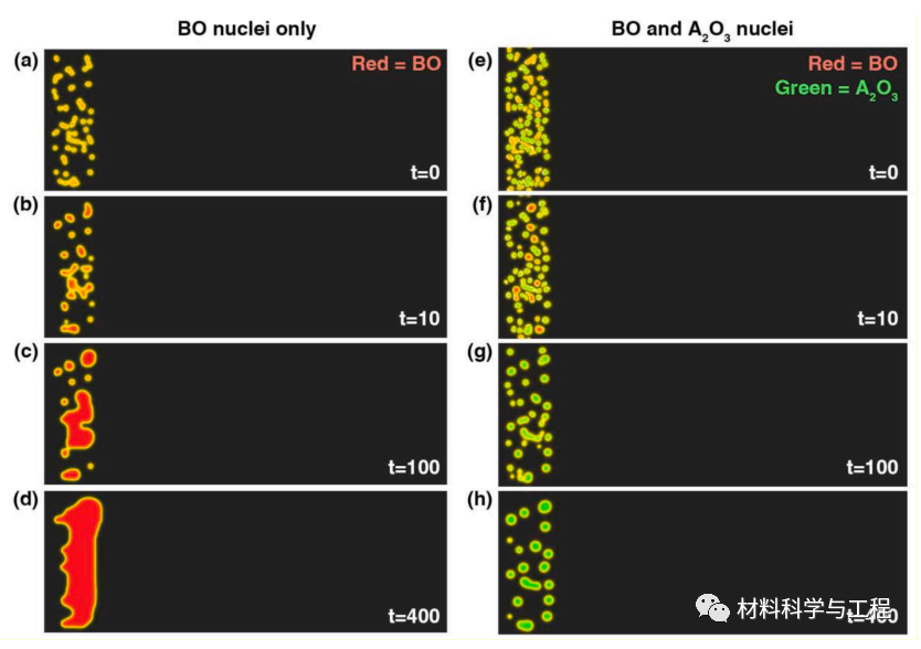 图 6. 在 2000 nm × 700 nm 的模拟区域中,(a)-(d)仅 BO 核和(e)-(h)BO 和 A2O3 核在相同条件下的氧化物模拟演化曲线。左边界是氧基质界面。