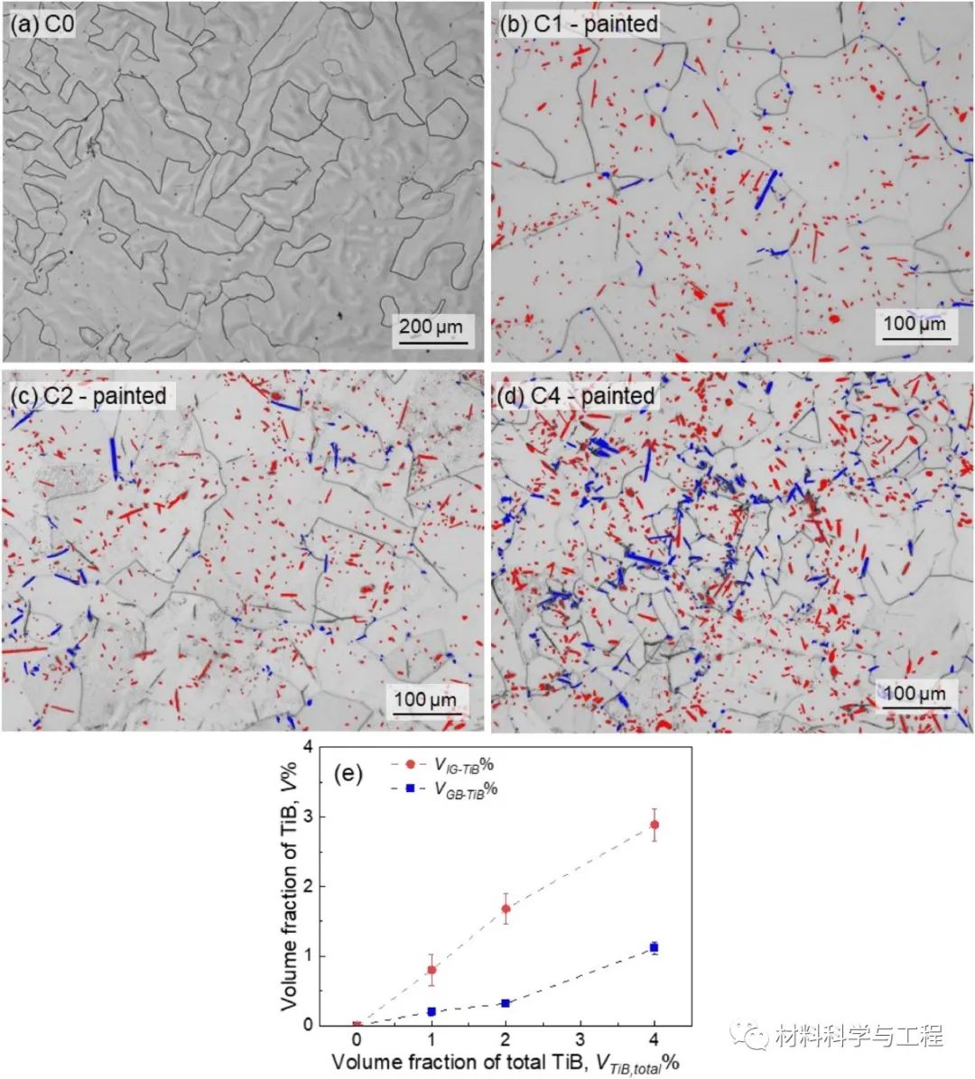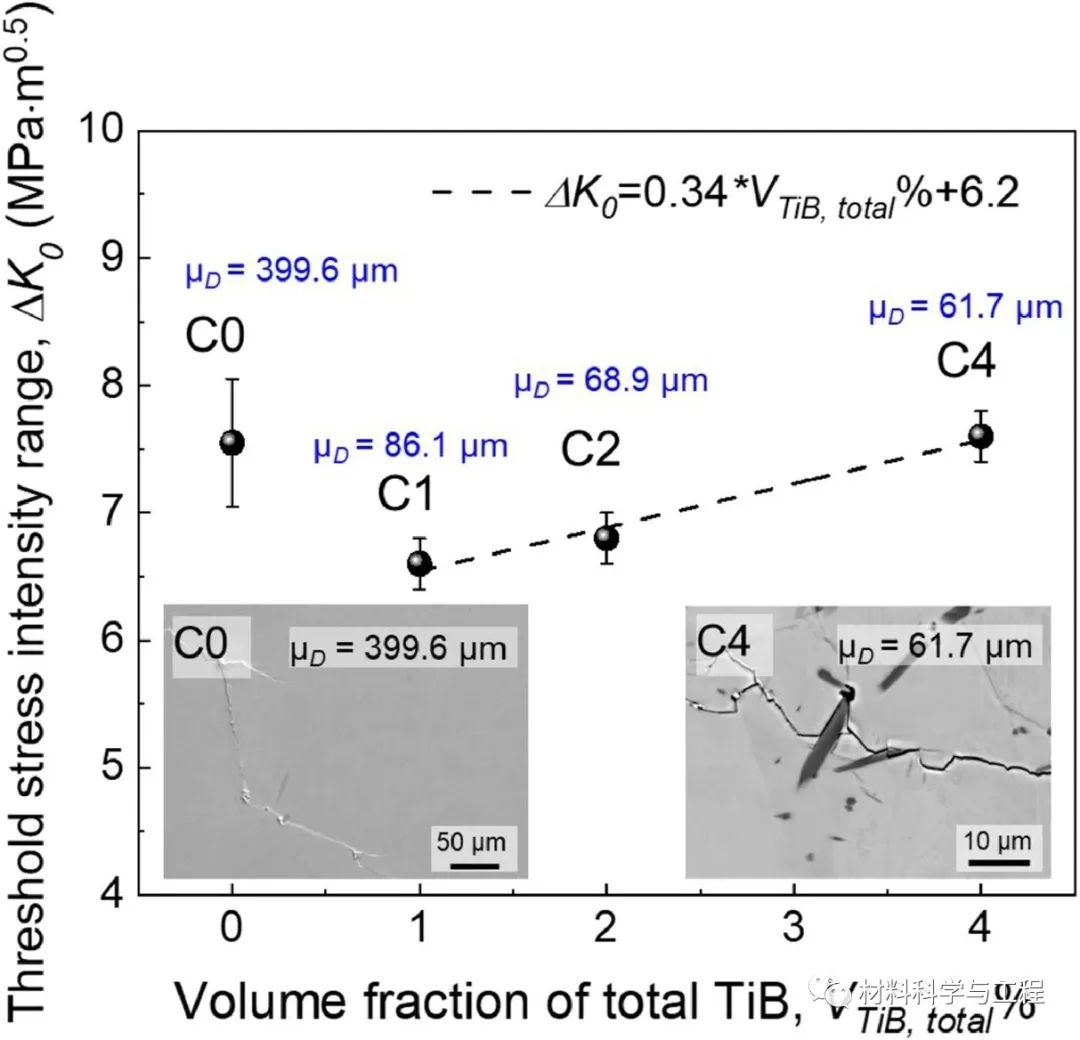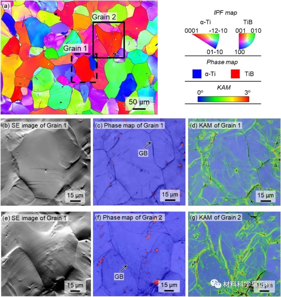 近期,西安交通大学材料学院的高义民教授团队的李强博士生,联合新加坡南洋理工大学的黄升博士、赵亚凯博士和Upadrasta Ramamurty教授,针对钛基复合材料(TMCs, Titanium matrix composites)中陶瓷相添加导致塑韧性降低问题展开研究。相关研究结果以“Simultaneous Enhancements of Strength, Ductility, and Toughness in a TiB Reinforced Titanium Matrix Composite”为题,发表在金属材料领域顶级期刊Acta Materialia上。https://doi.org/10.1016/j.actamat.2023.118995为进一步提高钛合金的比强度、比刚度及高温性能等,常向钛合金中引入陶瓷增强相制备钛基复合材料。但陶瓷相(如TiB)的添加,往往会降低复合材料的延展性和断裂韧性等,这主要是由于增强相颗粒常位于晶界处。该研究采用粉末冶金技术制备了TMCs(其中大部分一硼化钛(TiB)颗粒位于晶粒内),并对其微观组织、室温拉伸性能、I型断裂韧性和疲劳裂纹扩展行为进行了系统研究。结果表明,当大多数微米级TiB均位于晶内时,1 vol.%的TiB添加可实现强度、塑性和断裂起始韧性的同时提高!相对于无TiB添加的纯钛试样,1 vol.%TiB/Ti复合材料的屈服强度(σy)、断裂延伸率(ef)和断裂起始韧性(KQ)分别提高了93.9%、35.0%和67.0%。间断拉伸试验表明,GB-TiB(与晶界相交的TiB)和IG-TiB(完全位于晶内的TiB)在TMC变形过程中的作用存在显着差异。GB-TiB在材料颈缩之前发生断裂,表明它们限制材料塑性的作用;而大多数IG-TiB在材料断裂之前均保持完好,可在材料变形过程中作为位错滑移的障碍,提高Ti基体的应变硬化率。此外,还对制备的钛基复合材料的断裂力学进行研究,例如断裂韧性和疲劳裂纹扩展行为。几个世纪以来,学者们一直致力于研发出更强、更韧、更轻及更耐高温的材料,其中金属基复合材料(MMCs, Metal matrix composites)在过去的50年间收到了广泛关注。钛基复合材料因其高比强度、比刚度、优异的高温性能和较低的热膨胀系数等,在航空航天、汽车和民用等行业都有着很大的应用潜力,可用于替换传统材料以实现减重、提高使用性能和服役温度等目的。虽然已有大量的研究表明,相对于钛合金,钛基复合材料有着更好的高温服役性能,例如高温强度、抗氧化性和抗蠕变性能等,但室温脆性仍是钛基复合材料的一大瓶颈问题!近年来,针对TMCs的室温脆性问题,国内外学者们已开展了一系列研究,例如调控增强相的分布、降低增强相尺寸等,但是绝大部分钛基复合材料的塑性仍低于无增强相添加的钛合金。在本研究中,通过粉末冶金法制备了大部分微米级TiB(~80%)均位于Ti晶粒内部的钛基复合材料。在TiB体积分数为1%的钛基复合材料中,实现了强度、塑性和断裂起始韧性(KQ)的同时增强。对试样进行间断拉伸试验,研究讨论了TiB位置的重要性,结果表明,位于晶内的IG-TiB,在以平面滑移为主的α-Ti基体中,可阻碍位错滑移,促进双系滑移/多系滑移的开动,提高基体的加工硬化率,进而增强材料塑性。对疲劳裂纹扩展行为进行研究发现,在无TiB添加的C0试样中,粗大晶粒是裂纹偏转的原因,而在复合材料试样中,TiB主导了疲劳裂纹的偏转行为。表1. TMCs的化学成分、理论TiB体积分数以及用于制备的AlB2添加量图2. 有代表性的光镜照片:(a)C0试样,(b)C1试样,(c)C2试样,(d)C4试样。(e)随总TiB体积分数变化的GB-TiB和IG-TiB体积分数。(位于晶界的GB-TiB和位于晶内的IG-TiB分别用蓝色和红色突出显示)图3. C0-C4试样的室温拉伸行为:(a)工程应力应变曲线,(b)Kocks-Mecking曲线。图9. C1 样品表面(自由表面)在拉伸测试至约 8.5% 应变(接近颈缩)后的扫描电子显微照片: (a)低倍SEM, (b) 高倍SEM照片显示GB-TiB , (c–d)高倍SEM照片显示 IG-TiB。图11. 表明TiB的断裂主导试样的(a)颈缩和(c)断裂开始的示意图。(b)均匀延伸率随GB-TiB体积分数变化,(d)断裂延伸率随总TiB体积分数的变化。图12. 拉伸应变至~8.5%(接近颈缩)后C1样品的变形机制分析。(a)晶粒取向图(b,e)Grain 1和Grain 2的SEM图像,(c,f)Grain 1和Grain 2的相图,(d,g)Grain 1和Grain 2的KAM图。图13. 疲劳裂纹的侧表面照片:(a,b)C0试样,(c,d)C1试样,(e,f)C4试样。图14. 疲劳裂纹扩展门槛值随TiB总体积分数变化。插入图表示C0和C4试样中的裂纹偏转。