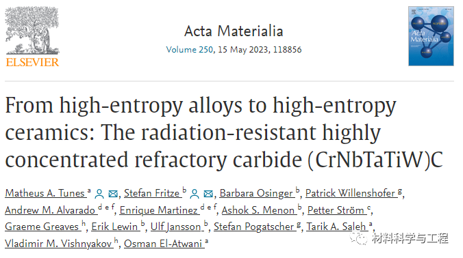 来自美国洛斯阿拉莫斯国家实验室和瑞典乌普萨拉大学的学者扩展了 HEA 概念,用于合成和表征新型高熵陶瓷作为新兴材料,可用于高能粒子辐射是主要关注点的环境中。使用磁控溅射合成了五元耐火系统 CrNbTaTiW 中的新型碳化物。该材料表现出纳米晶粒、单相晶体结构和约50at.% 的C含量。原位透射电子显微镜重离子辐照用于评估新型高熵碳化物 (HEC) 在573 K下的辐照响应,并与系统内的HEA进行了比较。在HEA和HEC 的微观结构中,当剂量达到每个原子 10 个位移时,都不会出现位移损伤效应。令人惊讶的是,HEC 在所研究的条件下并未发生非晶化。Xe 被植入材料和成核气泡中,但与传统核材料相比尺寸更小,这表明它们是用于核能的潜在候选者。相关文章以“From high-entropy alloys to high-entropy ceramics: The radiation-resistant highly concentrated refractory carbide (CrNbTaTiW)C”标题发表在Acta Materialia。