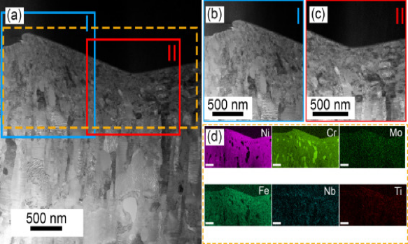 图8.( a )具有均匀分布纳米畴的异质结构的DF STEM显微照片,突出了近表面变形区域。区域I ( b )和II ( c )突出了样品的变形行为。( d )整个变形区域对应的EDS图谱,用虚线金盒突出显示。