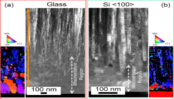 图3.溅射态( a )细NT和( b )粗NT样品的暗场STEM照片。基体和柱状晶区域之间的取向差生长区域用白色虚线箭头表示。每张显微照片都提供了具有极图的TKD图案,突出了靠近衬底区域的取向差。两个样品的生长方向均由( a )的橙色箭头所指。