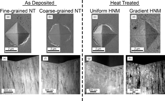 图7.维氏压痕的SEM照片( a-d )和BF STEM照片( e-h )分别为细晶NT结构、粗晶NT结构、均匀HNM和梯度HNM。所有Indent均采用10 g载荷。