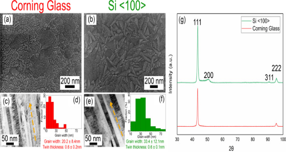 图2 .对沉积在(红)康宁鹰玻璃和(绿) Si衬底上的样品进行溅射表征,包括( a , b)顶面SEM照片、( c、e)明场TEM照片(黄色箭头表示生长方向)、( d , f)晶粒宽度分布和相应的( g ) XRD图谱。
