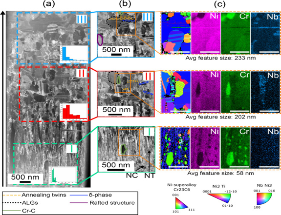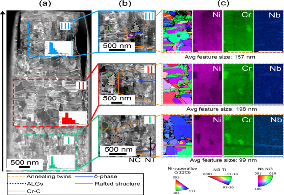 图6.( a ) NT异质纳米结构材料( HNM )示意图,( b )均匀HNM,( c )梯度HNM。异常大的晶粒由灰色形状,δ相由蓝色条纹,Cr - C由绿色球,筏状结构由条纹,紫色图案,退火孪晶由金线,和纳米晶结构由灰色八边形表示。生长方向由( a )左侧的黑色箭头指示。