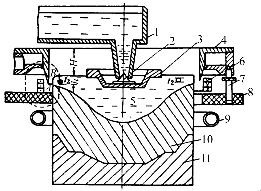 热顶铸锭时,由于结晶器冷却部分高度小,二次冷却水的逆流冷却作用较强,有效地防止了凝壳的二次重熔,从而抑制了偏析瘤的生成,同时在铸造过程中,有效地防止了金属液面处的过早冷却,使两相区变得相对稳定,能有效抑制冷隔,使得铸锭周边层逆偏析程度和深度大为降低。但热顶铸锭对结晶器设计和工艺参数控制精度要求更严格。气滑铸锭是一种将连续铸锭过程中凝固层与结晶器界面由滑动接触改为油气混合润滑状态的铸锭方法。如图7所示,高强铝合金的气滑铸锭往往与热顶铸锭技术联合使用。其原理是:在浇注过程中压缩空气和润滑油透过结晶器上的石墨环,在石墨环内壁形成油气膜,金属液在油气膜约束下外部凝固成壳移出结晶器,喷水进行二次冷却形成铸锭。由于在石墨环和金属液之间存在油气膜,可以显著降低一次冷却,减小凝壳厚度和液穴深度,避免低熔点偏析、冷隔,进而获得均匀细小的铸锭组织和良好的表面质量。油气膜可以降低结晶器与铸锭之间的摩擦力,同时由于液穴深度减小,可以减小结晶器的有效结晶高度,因此生产效率高,铸造速度快,比普通热顶铸造速度提高了25%。结晶器的热顶环与石墨环紧密配合,防止粘铝,引起铸铸锭表面出现拉痕。石墨环与结晶器为过盈配合,采用热装工艺装配,石墨环外壁上边沿和下边沿涂抹高温漆,以保证密封,防止空气和润滑油外漏。空气通过相应通道进入空气槽,在一定的压力下透过石墨环,润滑油通过相应通道进入润滑油槽,在大约比空气压力高10倍的压力下透过石墨环。空气和润滑油透过石墨环后,能在石墨环内壁形成油气膜,使铝液和结晶器不直接接触,因此形成均匀的油气膜晶是该项技术的关键环节。在铝液下降过程中,可设计成双排冷却喷水结构,增大冷却水的喷射角和喷射速度,从而消除冷却水喷溅,提高冷却效率,减少冷却水用量。从上述高强铝合金DC铸锭过程中两相区形成的基本规律可以看出,仅仅是通过结晶器的改进、优化,对两相区的影响是有限的。通过在结晶器外圈引入电磁场(见图8)、在结晶前沿和/或熔体中引入超声场,以及同时引入电磁场、超声场等复合外场,对凝固层的质量场、动量场及温度场施加影响,可以进一步增强对两相区尺寸、过渡区、液穴深度、内应力等凝固层特征参数,甚至结晶前沿的晶核特性进行精细调控,有望制备出规格尺寸更大、品质更优的铝合金铸锭。