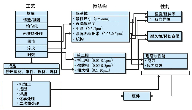 现代铝合金材料正朝着高综合性能、低密度、大规格、高均匀性和材料/结构一体化方向发展,为航空航天、交通运输和高端装备的高性能制造提供支撑。高综合性能铝合金是高强铝合金材料科学与工程研究的热点。如上所述,新型高强铝合金的研发及现有材料性能的提升都与铝合金成分的创新相关。但是,当成分确定后,实现高综合性能的特征微结构需经过复杂的制备工艺流程才能最终获得,其间冶金遗传效应显著,各个制备环节均会影响微结构的形成和演变,从而最终决定材料的综合性能及其均匀性。如图6所示,高强铝合金材料的重要特征微结构可概括为:在Al基体上弥散分布着凝固形成的微米结晶相,高温沉淀析出的亚微米或纳米弥散相,时效析出的纳米亚稳相。基体组织可概括为:固溶体,晶粒,亚晶粒,晶界/亚晶界,胞状结构,织构,无沉淀析出带,空位与位错等。多尺度的第二相和复杂结构的基体决定了铝合金的性能。值得注意的是,除第二相、晶粒等组织结构外,铝合金材料织构也是研究人员关注的因素。