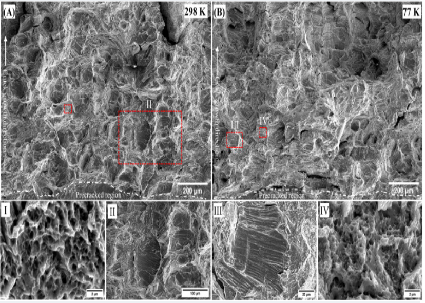 C ( T )试样在( A ) 298K和( B ) 77K断裂韧性测量后的SEM断口图。图中用红色点线、Ⅰ和Ⅱ、Ⅲ和Ⅳ表示区域的放大图像。A和B位于图像的最底层。图5A、B为超载破坏试样的断口形貌照片。这些断裂面具有微孔的双峰分布,具有较大的尺寸( ~72 ± 18 µ m )和较小的尺寸( ~ 0.4 ± 0.2 µ m )。较大的微孔尺寸与激光扫描轨迹的宽度相近,即在BD平面上测量的~69 ± 9 µ m (图2B )。在这些大的微孔洞(例如,在图5A和B中的位置Ⅱ和Ⅲ)的底部,可以观察到一个似解理断裂,其表面具有紧密间隔的线条,宽度为~0.8 ± 0.3 µ m。